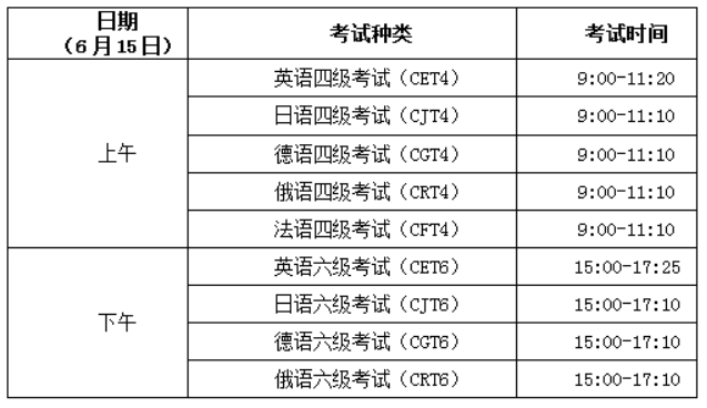 英語四級(jí)口語考試(CET-SET4)考試時(shí)間為5月25日,英語六級(jí)口語考試(CET-SET6)考試時(shí)間為5月26日,具體場(chǎng)次安排如下:
